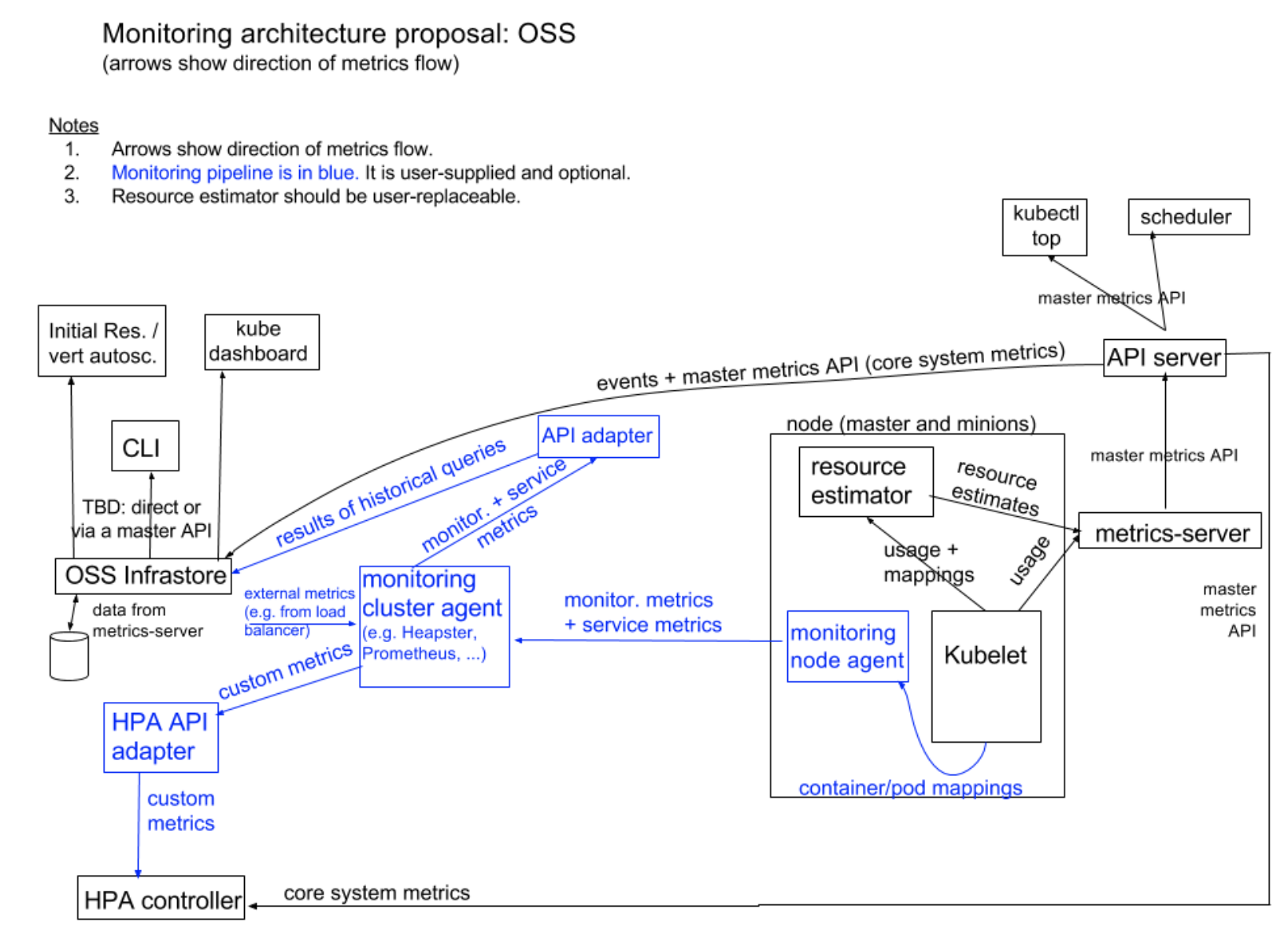 쿠버네티스에서 직접적으로 관여하지 않으며, 주로 Kubernetes Cluster 사용자들이 필요한 자원을 모니터링 하는데 사용된다. 별도의 외부 서드파티(3rd-party) 모니터링 시스템인 프로메테우스(Service Metric을 수집하는 별도의 Agent)를 통해 서비스 디스커버리(Service discovery), 메트릭 수집(Retrieval) 및 시계열 데이터베이스(TSDB, Time Series Database)를 통한 저장, 쿼리 엔진을 통한 PromQL 사용과 Alertmanager를 통해, 해당 Metric을 Dashboard로 확인하거나 HPA로 전송한다.