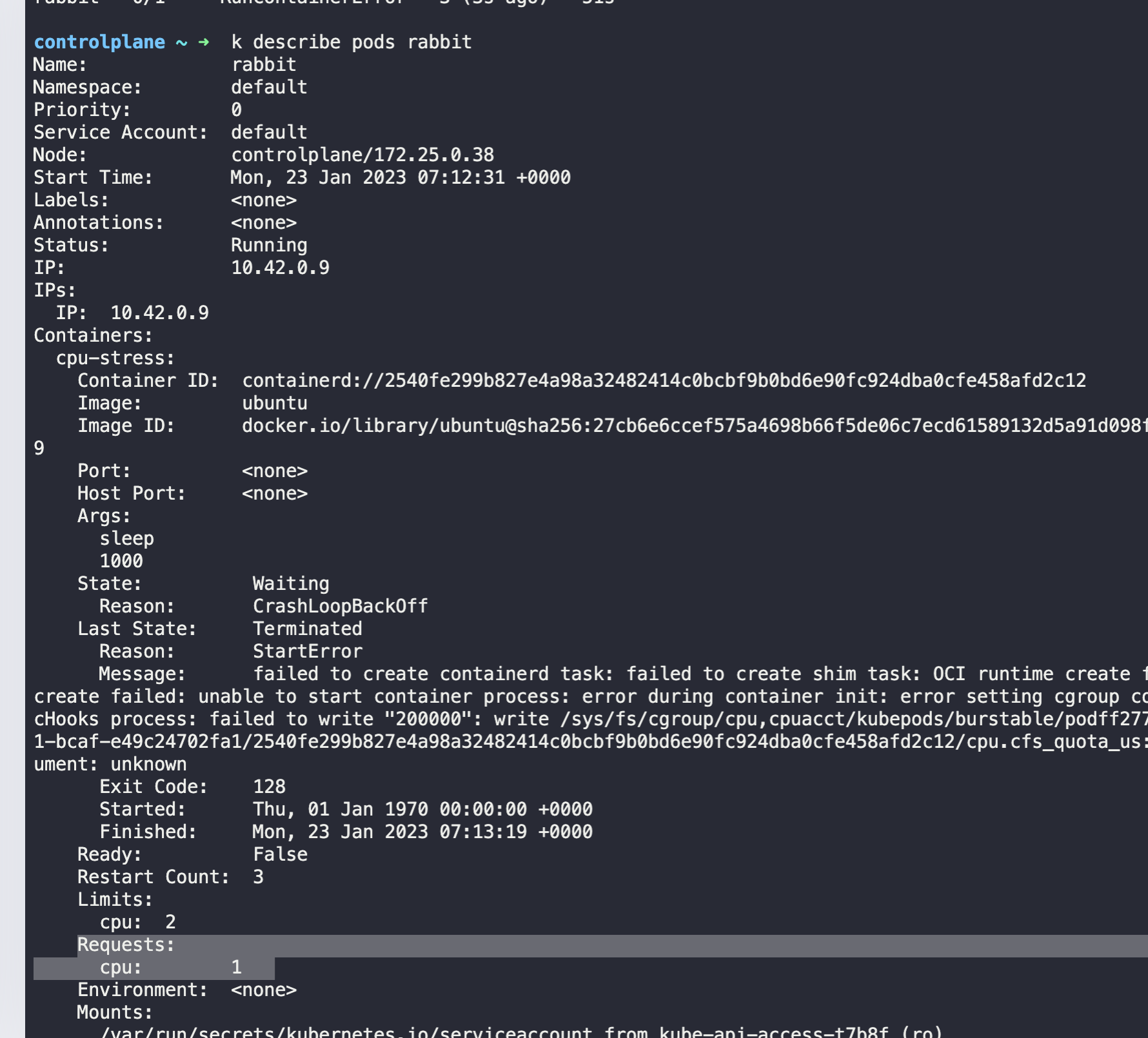 Q1. A pod called rabbit is deployed. Identify the CPU requirements set on the Pod