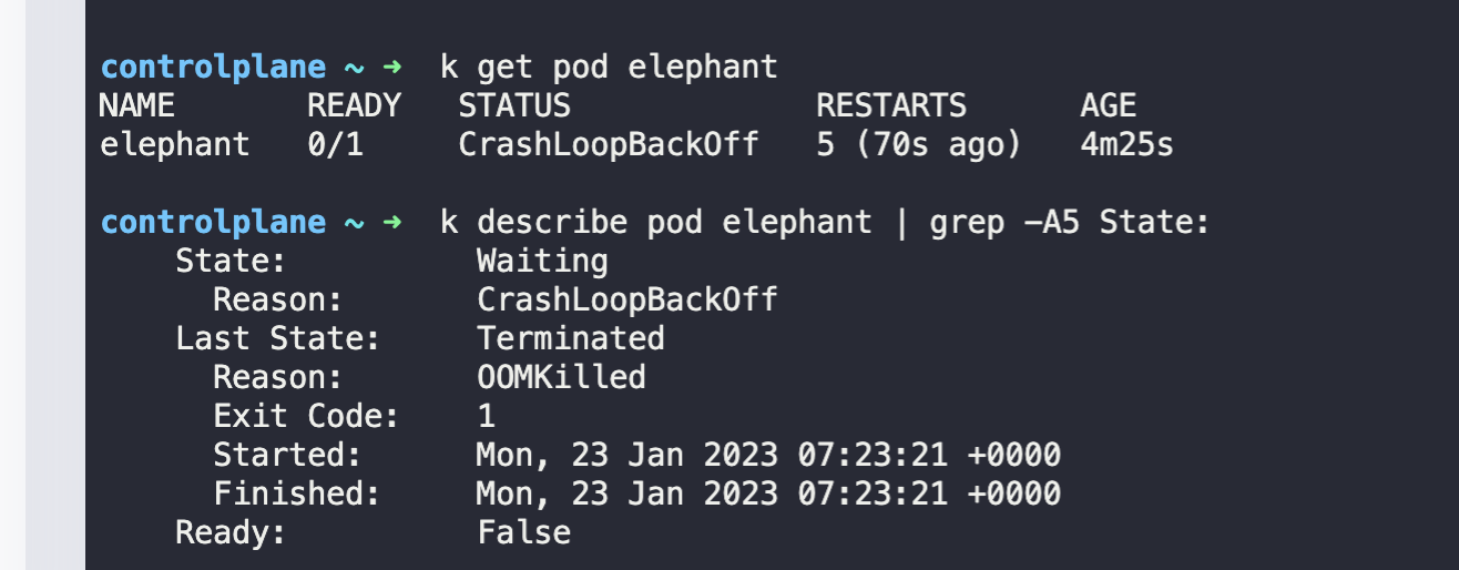 Q3. Another pod called elephant has been deployed in the default namespace. It fails to get to a running state. Inspect this pod and identify the Reason why it is not running.