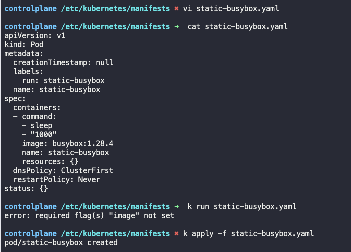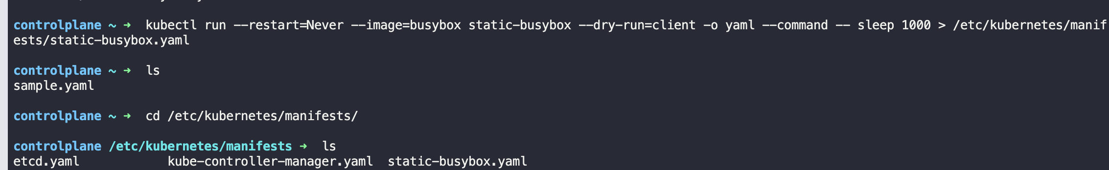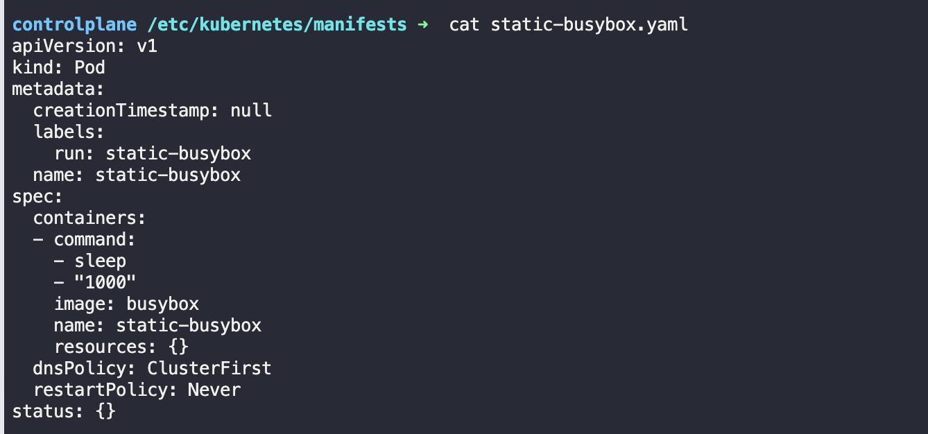 kubectl run --restart=Never --image=busybox static-busybox --dry-run=client -o yaml --command -- sleep 1000 > /etc/kubernetes/manifests/static-busybox.yaml