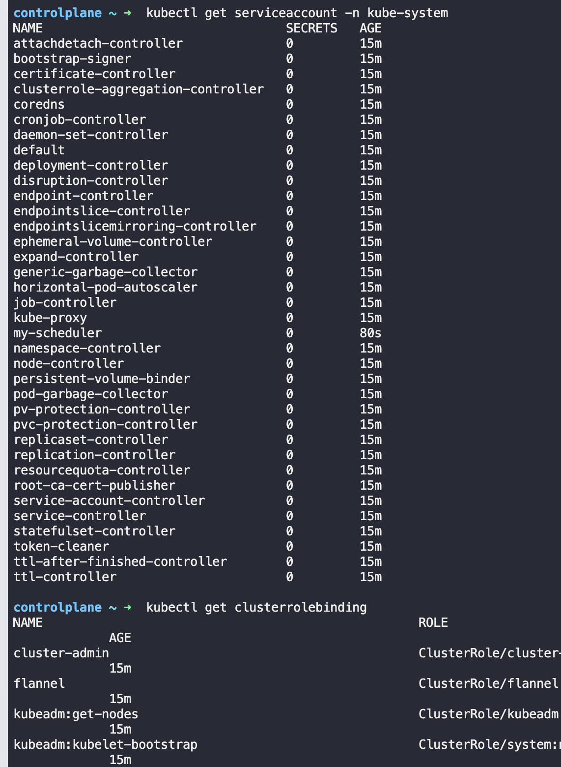 Q3. We have already created the ServiceAccount and ClusterRoleBinding that our custom scheduler will make use of. Checkout the following Kubernetes objects: ServiceAccount: my-scheduler (kube-system namespace) ClusterRoleBinding: my-scheduler-as-kube-scheduler ClusterRoleBinding: my-scheduler-as-volume-scheduler Run the command: kubectl get serviceaccount -n kube-system and kubectl get clusterrolebinding