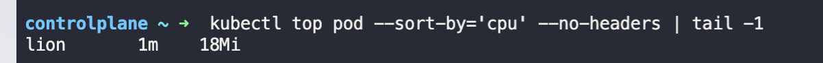kubectl top pod --sort-by='cpu' --no-headers | tail -1