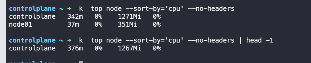 k top node --sort-by='cpu' --no-headers | head -1
