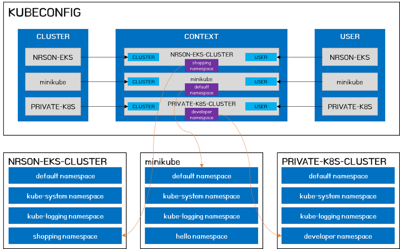 쿠버네티스 클러스터를 관리하는 CLI 도구인 kubectl에는 환경을 바꿔가며 Config 파일을 이용하여 클러스터를 관리할 수 있는 context 라는 기능이 존재한다. CLI를 활용하여 어느 쿠버네티스 클러스터를 컨트롤할지 결정할 수 있다.