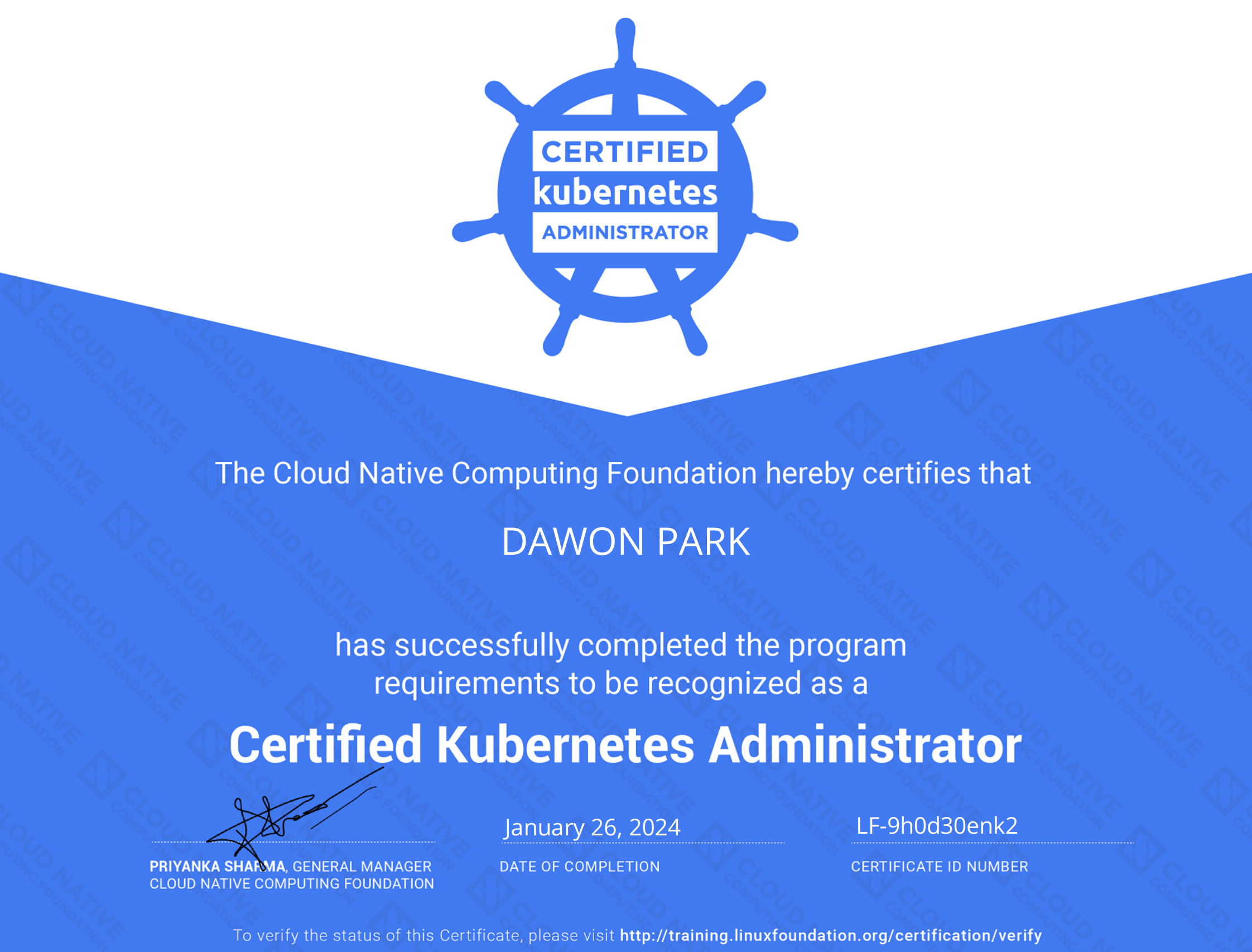 그러다 1년 뒤 24년 1월 만료 일자가 다가오며 어쩔 수 없이 시험일정을 잡게 되었고 그렇게 cka에 합격하게 되었습니다.