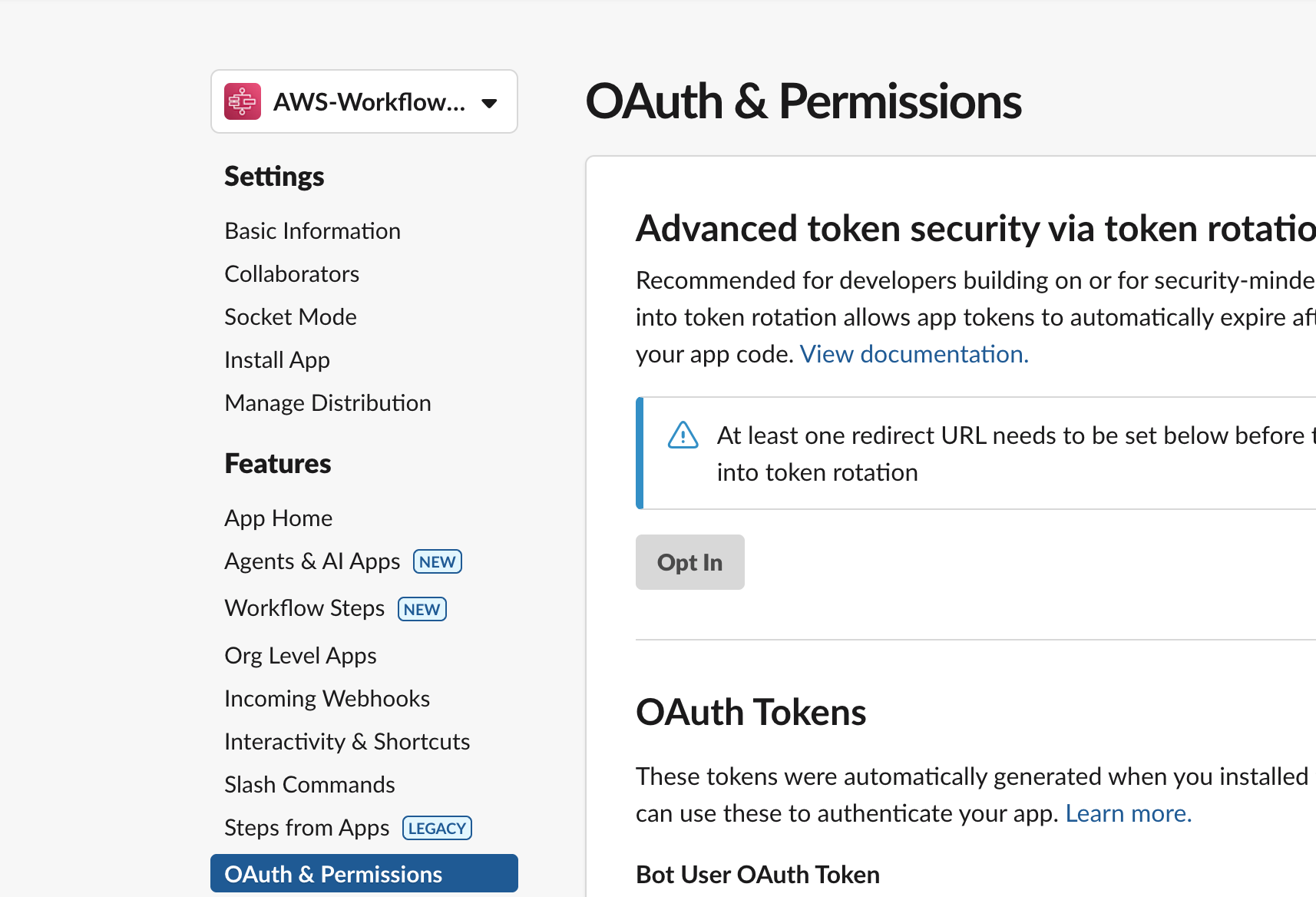 1. 생성된 앱의 설정 페이지에서 Features > OAuth & Permissions 메뉴로 이동합니다.