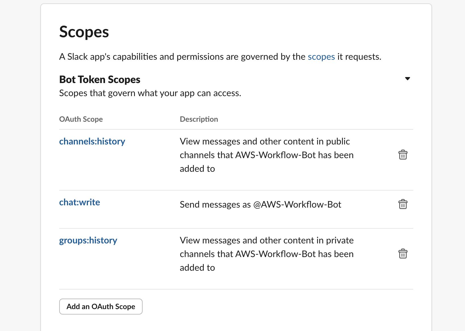 2. Scopes 섹션까지 스크롤을 내린 후, Bot Token Scopes 그룹에서 Add an OAuth Scope 버튼을