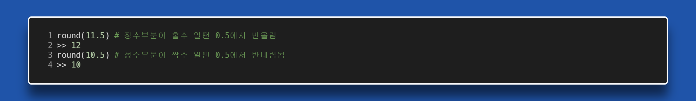 python의 round 함수를 이용해 보통 반올림/반내림을 하게 되는데 round( )는 정수부분이 짝수이냐 홀수있냐에 따라 0.5에서 반올림/반내림이 달라진다.