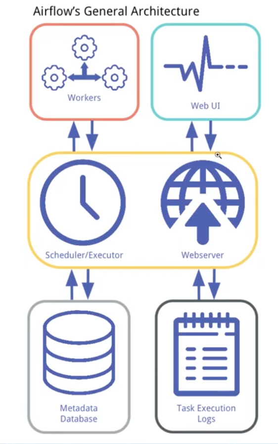 메인 스케줄러가 있는데 수많은 워커들을 관리해 워커 플로우를 처리한다. 그렇게 된것들을 maetadata DB에 저장도하고 task실행한 로그도 쌓는다. 워커가 여러대의 환경에서 분산실행 가능하게 만들어주는것이 에어플로우의 장점!