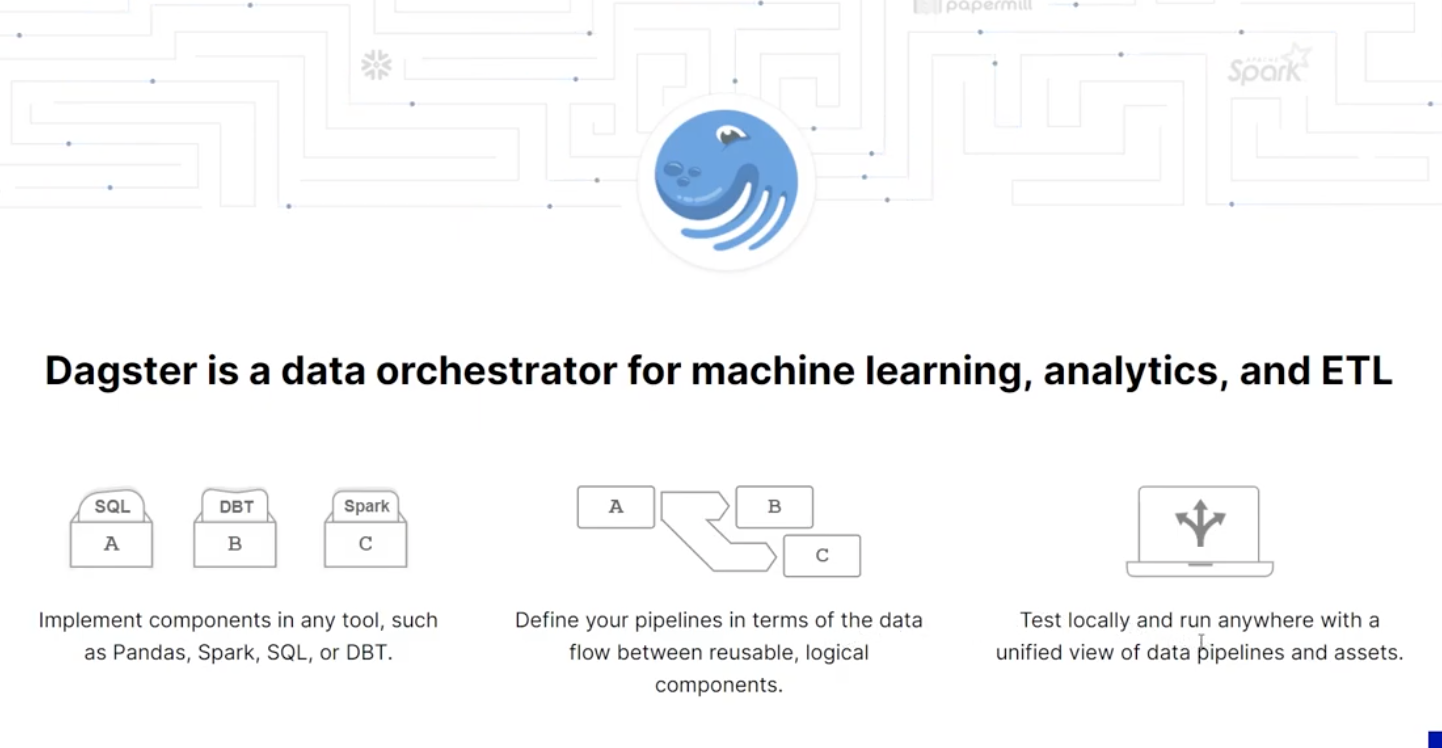 - Dagster: 에어플로우랑 비슷, DAGs로 구성된 데이터를 변환하는 모든것들을 하나의 어플리케이션으로 만드는 도구.