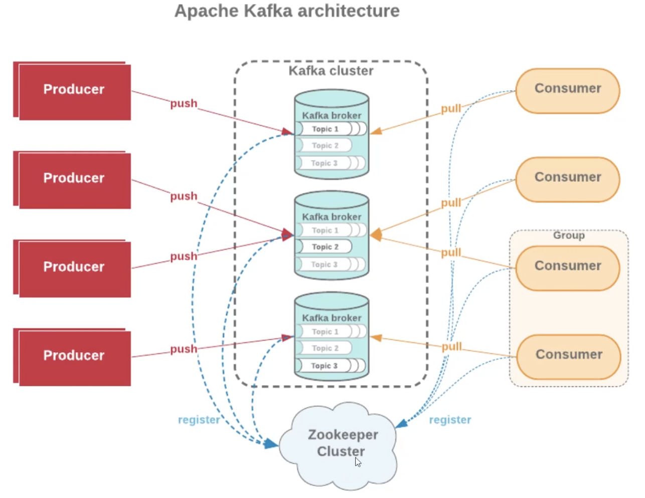 주키퍼 클러스터는 카프카 서버들이 등록할때 서버 뜨고, 죽었는지 관리. 컨슈머들이 이 토픽 받아갈게요라고 등록하는 관리.