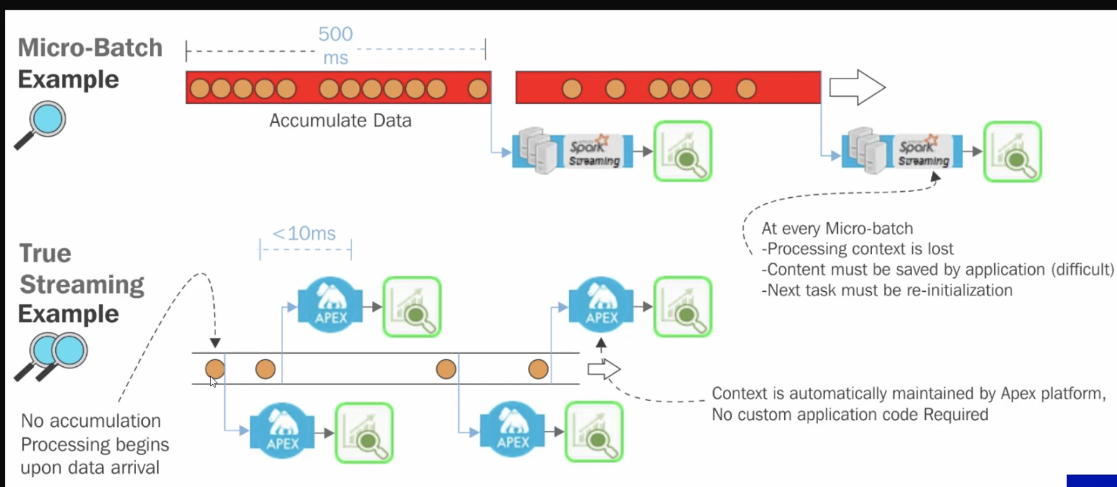 spark는 스트리밍을 제어한다. spark는 기본적으로 분산처리인데 배치기반이고 이걸 마이크로 배치(500ms)라고하는 걸로 모아서 처리하다보니 실시간 처리(1초에 2번씩 일이 일어나니까) 처럼 보인다. native streaming은 데이터가 들어올때 하나하나 처리가 가능하다.