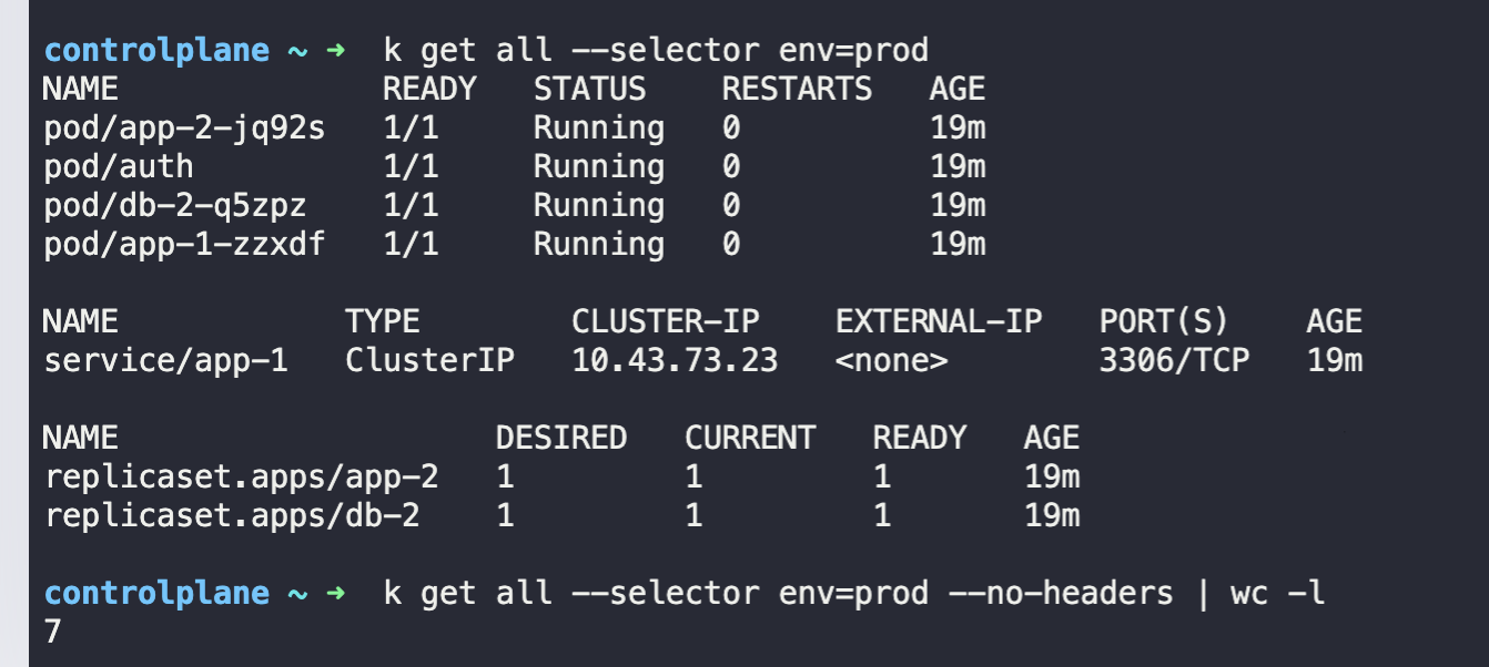 k get pods --selector env=dev --no-headers | wc -l #개수 세기